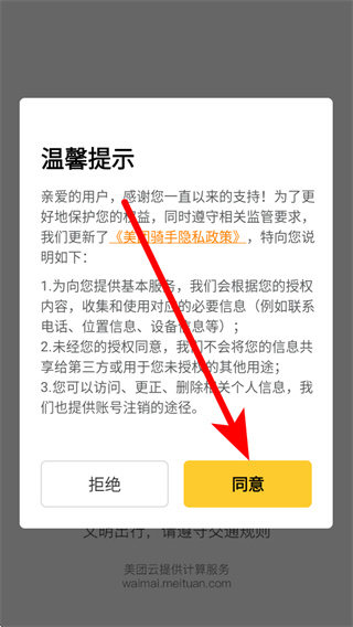 1、打开美团骑手,弹出弹窗后,点击同意,进入登录页面。
