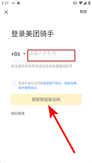 2、在登录页面的手机号框中填写手机号码,勾选协议后,点击获取短信验证码。