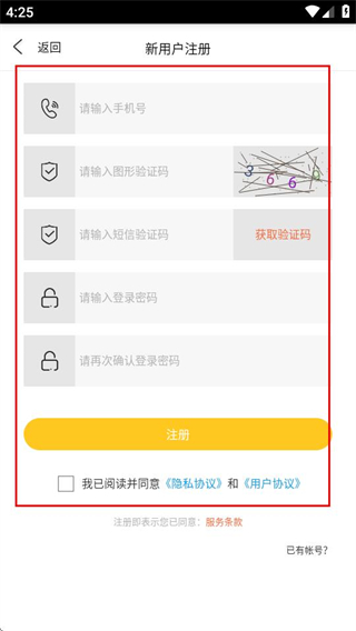 3、在注册页面,填写信息勾选协议,点击注册按钮即可完成账号注册。