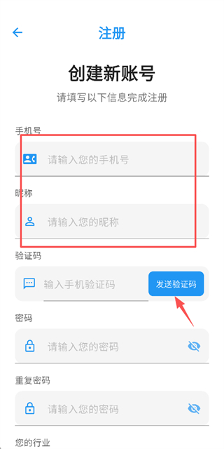 2、在注册账号页面填写手机号码和昵称后,点击发送验证码。