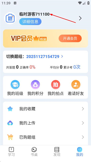 2、在个人页面,点击临时游客711100区域,进入登录页面。