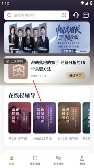 1、进入首页后,点击在线轻辅导下的目标课程条目,可进入该课程的详情页面。