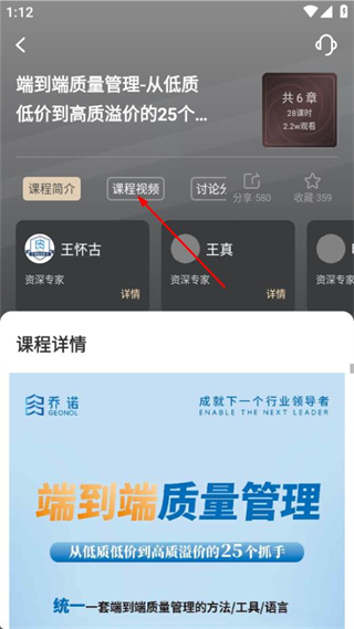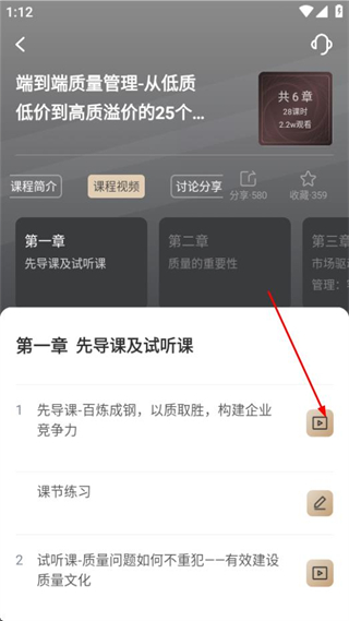 2、在课程详情页面,点击课程视频选项,可展开课程章节列表。