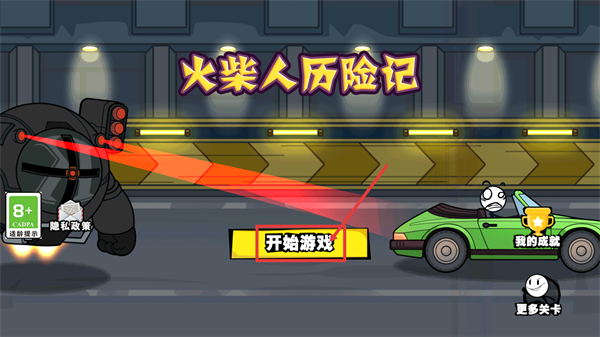 1、进入【火柴人历险记】后,点击【开始游戏】按钮启动关卡,同时可查看【我的成就】【更多关卡】等功能入口。