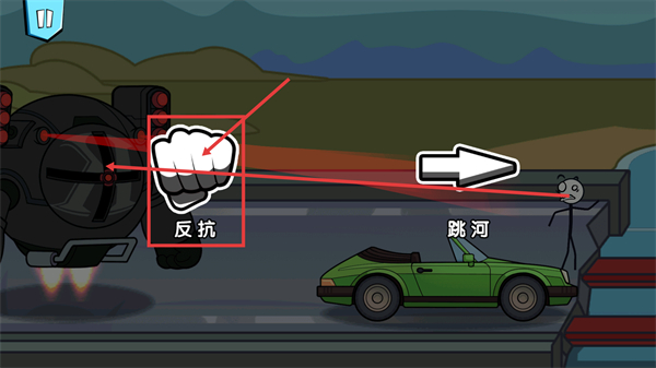 2、面对机关威胁时,选择【反抗】选项可触发对应交互,相比【跳河】能推进关卡的战斗类流程。