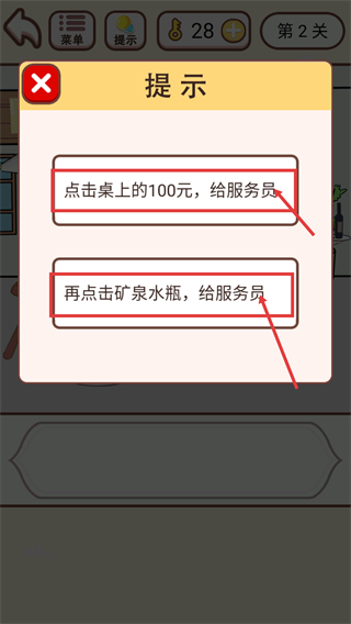 2、按提示流程操作:先点击桌上的【100元】给服务员,再点击【矿泉水瓶】给服务员,推进关卡进度。
