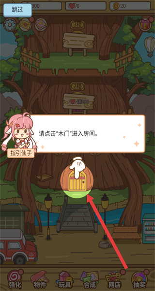 1、在树屋主界面,跟随指引仙子的提示,点击“木门”,进入对应的房间,开启后续的养成玩法流程。