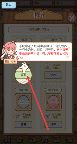 3、在领养界面,按照教程引导,点击小奶狗对应的“领养”按钮完成宠物领养。