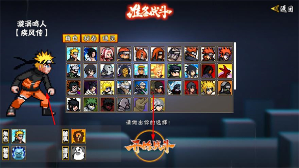 3、进入准备战斗界面后,选择出战角色,如漩涡鸣人【疾风传】,点击开始战斗。