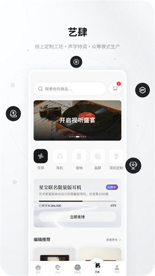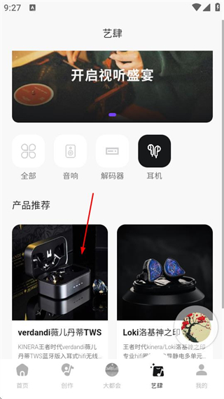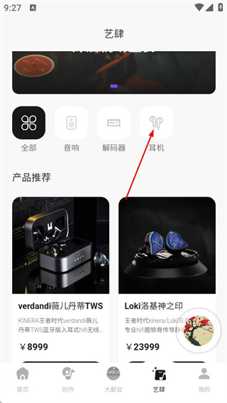 2、在艺肆页面,点击耳机分类,可筛选出耳机类产品。