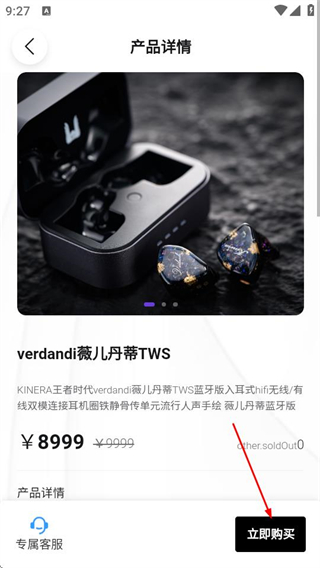 4、在产品详情页面,点击立即购买按钮,即可进继续耳机的购买流程。