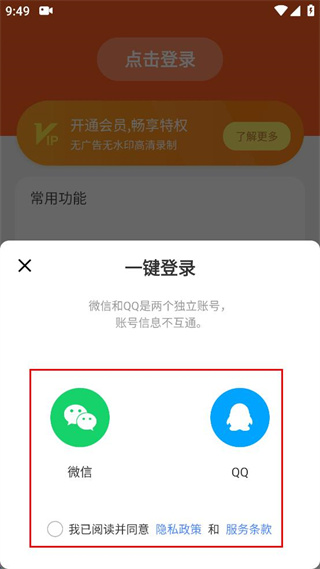 3、在一键登录选项框中选择微信或QQ,勾选同意隐私政策和服务条款后完成登录。