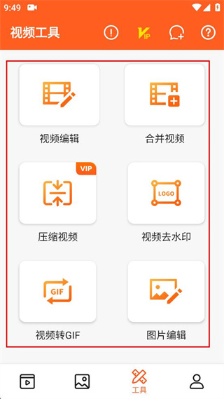 4、登录后点击底部“工具”图标,进入视频工具界面,可选择视频编辑、合并视频等功能进行操作。