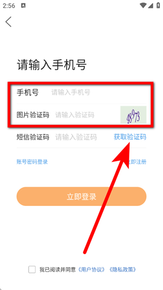 3、在登录页面,输入手机号和图片验证码,点击获取验证码。
