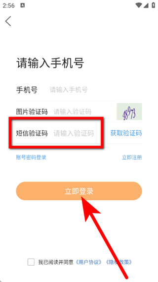 4、在短信验证码框,勾选后,点击立即登录,完成账号登录。