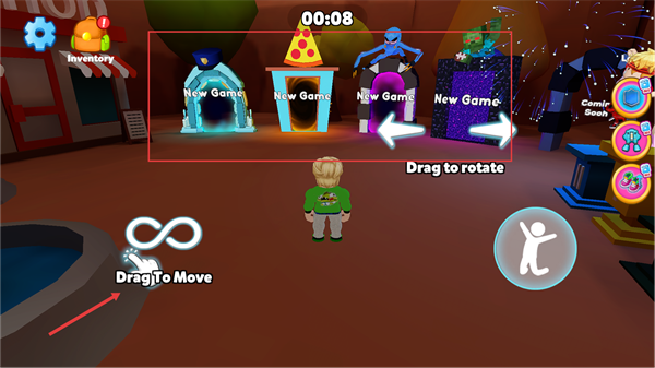 2、进入后看到【00:08】计时,按【Drag-To-Move】-【Drag-to-rotate】操作角色,选择对应【New-Game】传送门进入关卡。