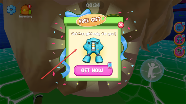 4、流程中弹出【FREE-GIFT】窗口,显示专属道具,点击【GET-NOW】(需看广告)即可领取该免费道具,增强角色能力。