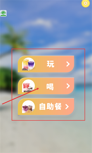 1、进入界面后,可看到【玩】-【喝】-【自助餐】三类选项,按指引选择【喝】选项,即可进入对应的饮品相关操作模块推进流程。