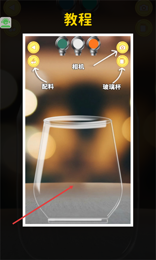 3、查看【教程】界面,可了解到界面含【配料】-【相机】-【玻璃杯】等功能按钮,先按指引确认【玻璃杯】容器,为后续制作做准备。