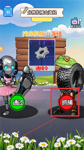 2、在找出机械山海经任务,观察怪物是否有机械部件,如轮胎青蛙,正确则点击【抓捕】按钮完成判断。
