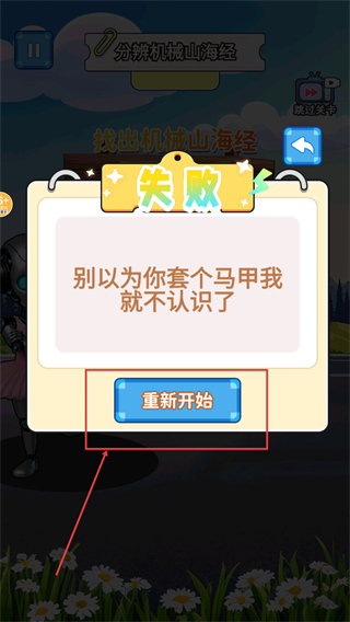 4、若关卡失败出现【失败】提示,点击【重新开始】按钮,再次挑战时需更仔细识别机械山海经怪物。