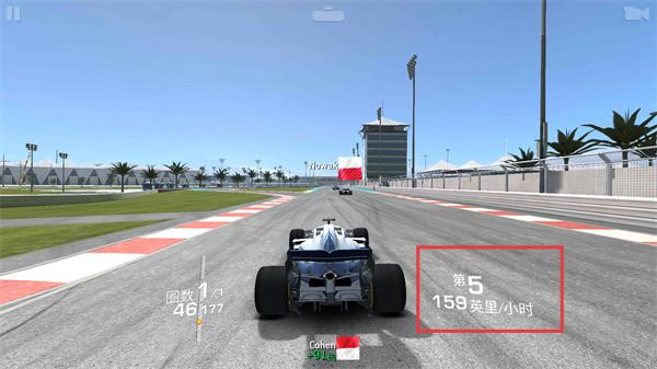 1、赛程中关注【圈数1/1-48.177】与【第5-159英里/小时】,操控车辆保持赛道内行驶,逐步提升速度。