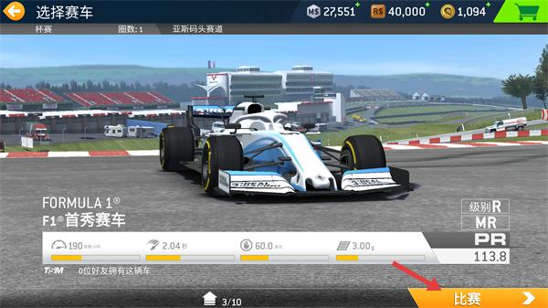 1、在【选择赛车】界面选定【FORMULA1-F1·首秀赛车】后,点击【比赛】按钮进入赛程。