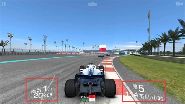 2、赛程中关注【圈数1/1-20.465】与【第5-114英里/小时】,操控车辆紧跟前车保持节奏。
