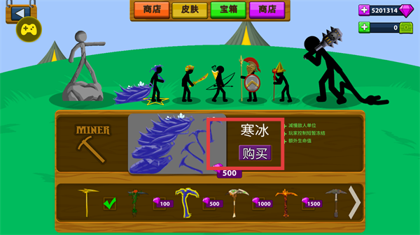 2、选择【寒冰】矿工皮肤,确认消耗【500】货币后,点击【购买】按钮获取该皮肤并装备。