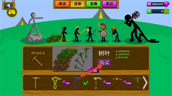 3、选择【树叶】矿工皮肤,消耗对应货币后点击【购买】按钮,解锁该皮肤用于更换外观。