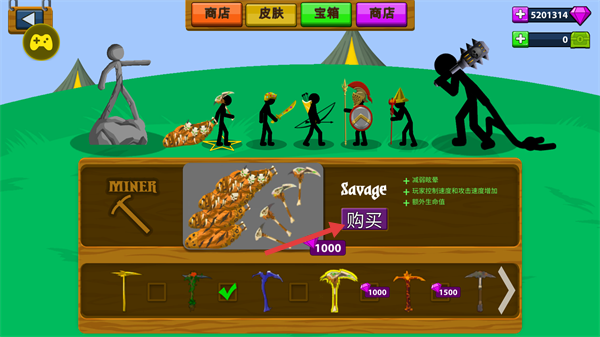 4、选择【savage】矿工皮肤,消耗【1000】货币后点击【购买】按钮,获取该皮肤丰富外观选择。