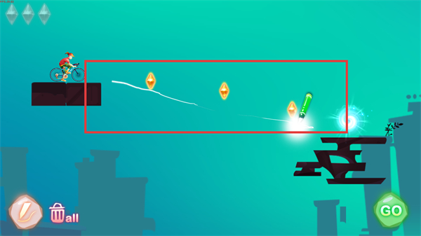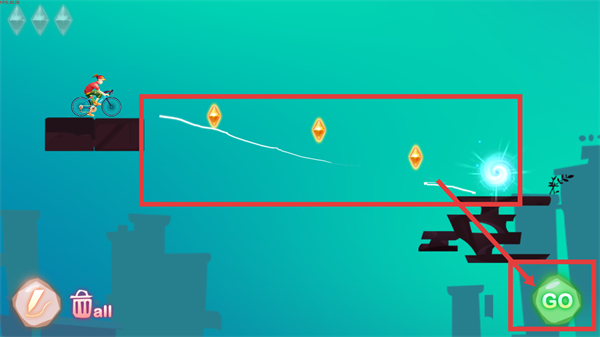 2、使用画笔画出轨迹后,轨迹会连接角色与目标区域,能引导角色顺利获取路径上的【钻石】啦。