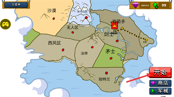 1、在地图界面选择【弓箭手】区域,点击【开始】进入关卡,可借助【商店】【军械】准备资源。