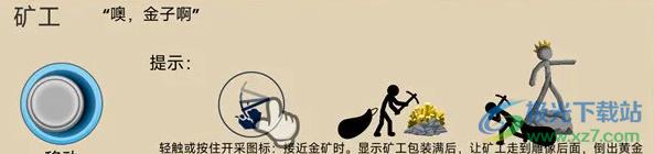 正常情况下,矿工会自动前往空闲矿点开矿,每个矿点能容纳两个矿工,在“矿工匆忙”道具效果下,矿工挖矿速度会变快并且矿工包有双倍容量,玩家控制矿工挖矿也会有更快的挖矿速度