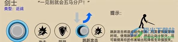 剑士会预判敌兵行动,然后使用跳斩攻击,跳斩伤害是普攻的 2.5 倍,人机剑土跳斩技能用后有 10 秒冷却玩家控制的剑士跳斩冷却为 5秒,剑士站立时,遇到敌兵接近或抛射物会进入防御状态,防御有 70% 降伤。