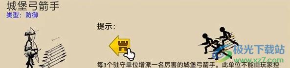 城堡射手是一种特殊弓箭手,相对于一般弓箭手,攻距更长,基伤更高并且不会被敌兵攻击,不会死亡但是不能玩家控制,有单位回城时出现第1个城堡射手而后每有 3个单位回城城堡射手数量加1,城堡射手最多出现4个,城堡射手爆头伤害也是基于基伤加22。