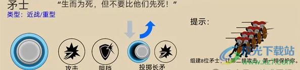 在接近敌人或遇到抛射物时会进入防御状态,同时移速变慢,矛士防御也是 70% 降伤,矛士有概率格挡敌兵攻击(免伤)。