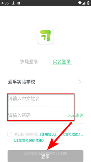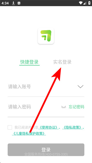 4、在实名登录页面填写账号密码,勾选相关协议,点击登录完成账号登录。