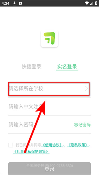 2、在实名登录页面点击请选择所在学校栏,进入学校选择界面。