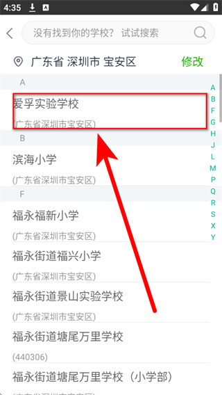 3、在学校选择界面中,选中目标学校,返回实名登录页面。