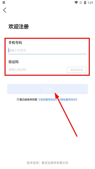 4、在注册页面填写手机号码,点击获取验证码后填入验证码,勾选协议后点击下一步完成注册。