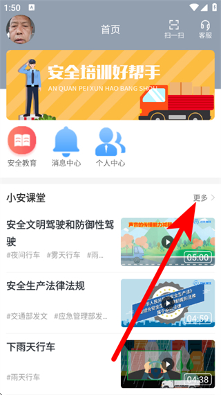 1、在晋交安培首页,在小安课堂右侧点击更多,进入内容列表页面。