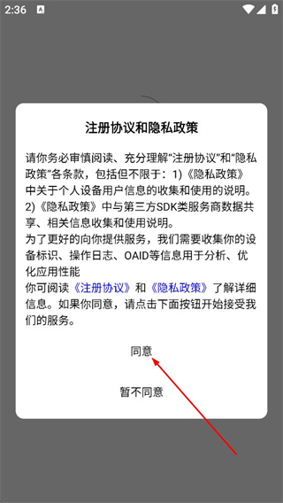 1、阅读注册协议和隐私政策后,点击弹窗中的同意。