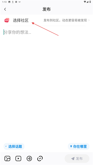 2、进入发布页面内,点击选择社区的功能按钮。