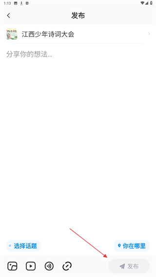 4、选择后进入编辑页面,分享想法后点击发布即可。