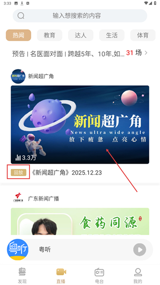 1、启动广东广播电视台APP,进入首页点击下方直播的图标。
