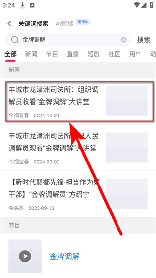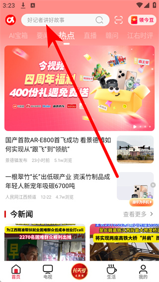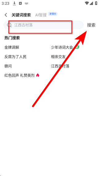 1、打开手机江西台,点击首页顶部的搜索框,进入关键词搜索页面。
