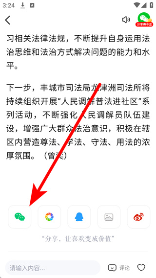 4、在文章详情页的底部,选择对应的分享渠道,点击即可将文章分享至微信。