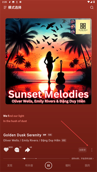 1、启动抖音音乐APP,进入首页点击右下三个点图标。