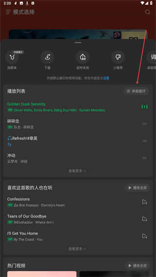 2、当页面弹出菜单栏时,找到并点击单曲循环的按钮。
